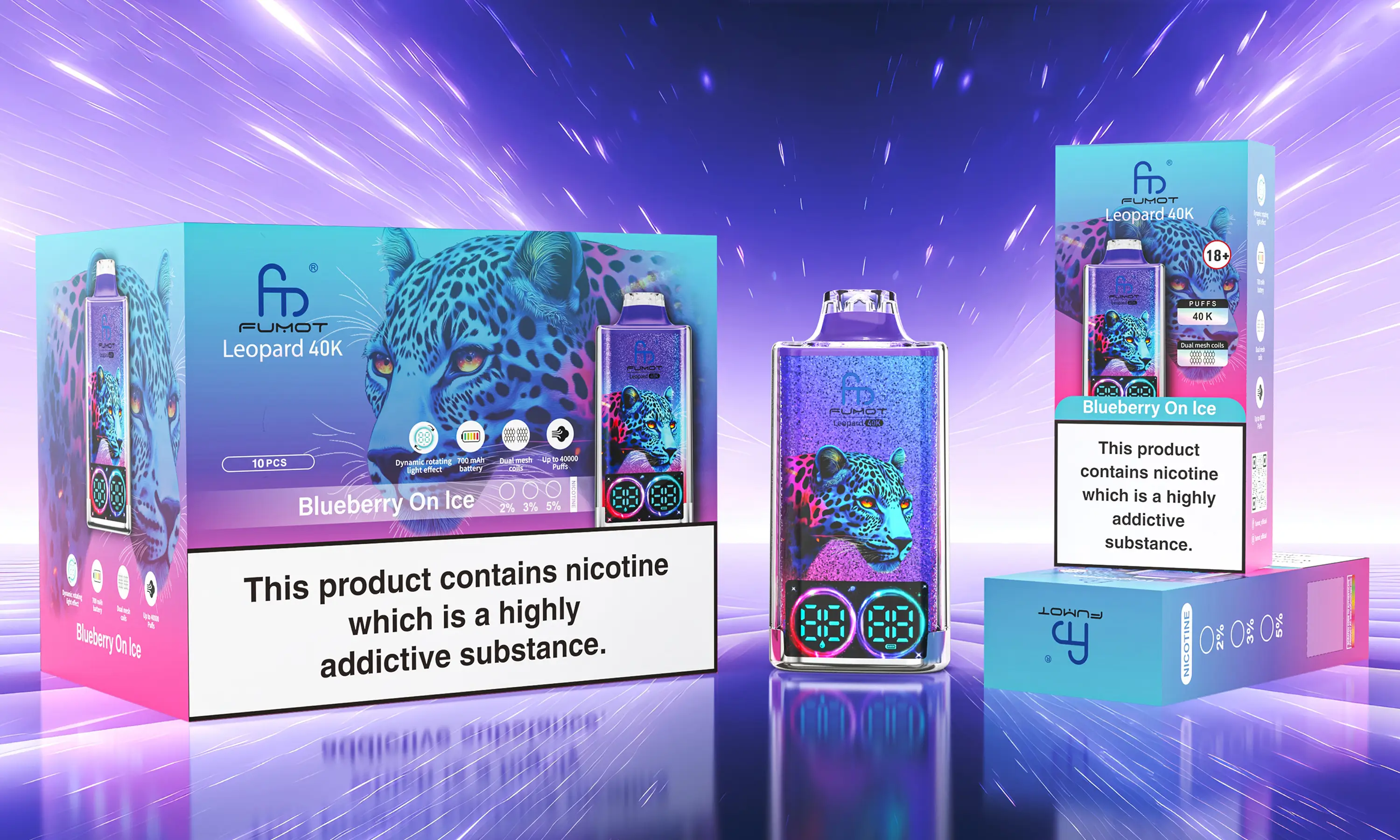 最大40,000回吸引可能、RGBライトとデジタルディスプレイ搭載のFumot Leopard。Dual Mesh Coil&Type‑C充電対応で、パワフルでもクリアな味わいを持続。