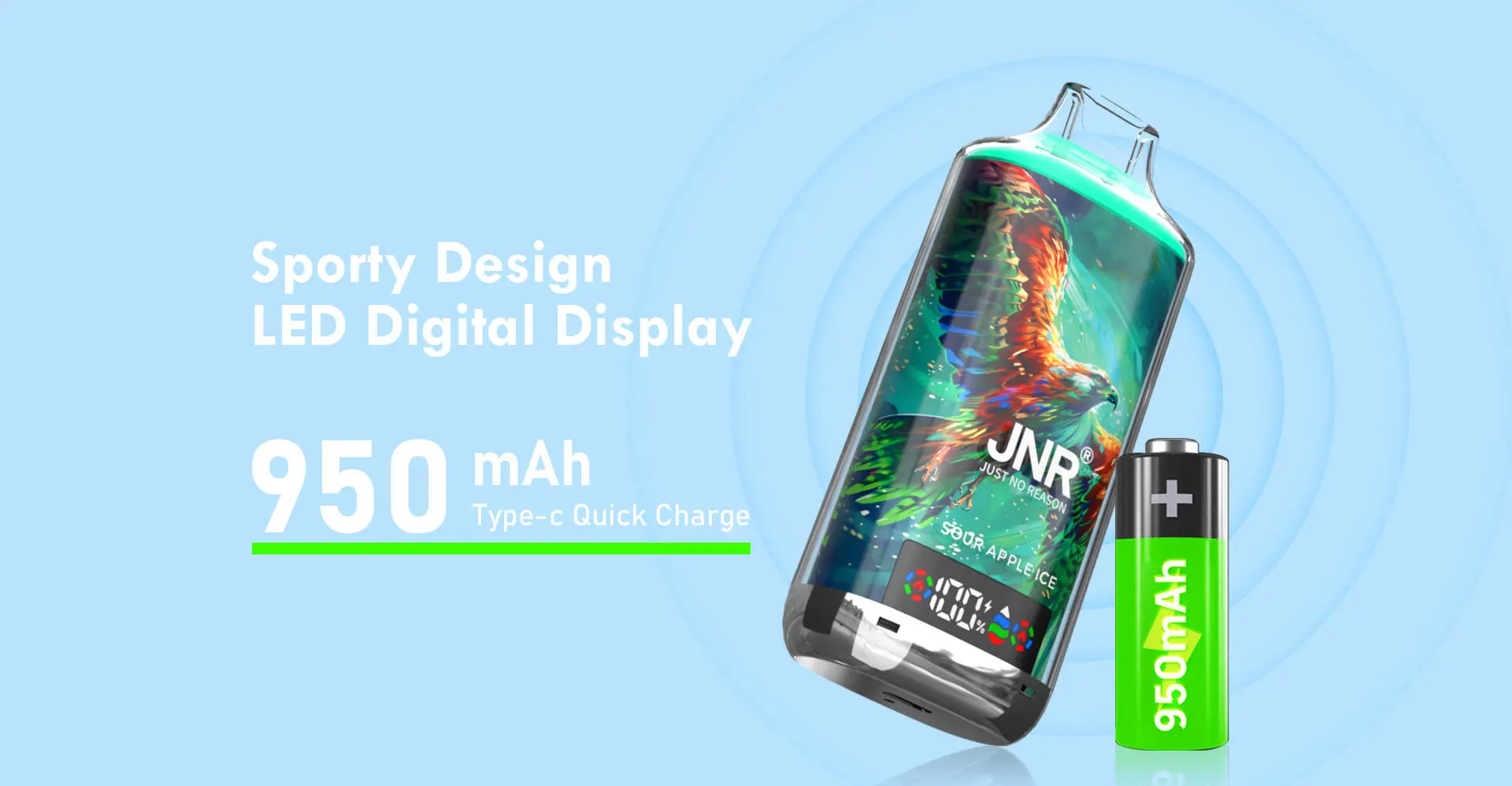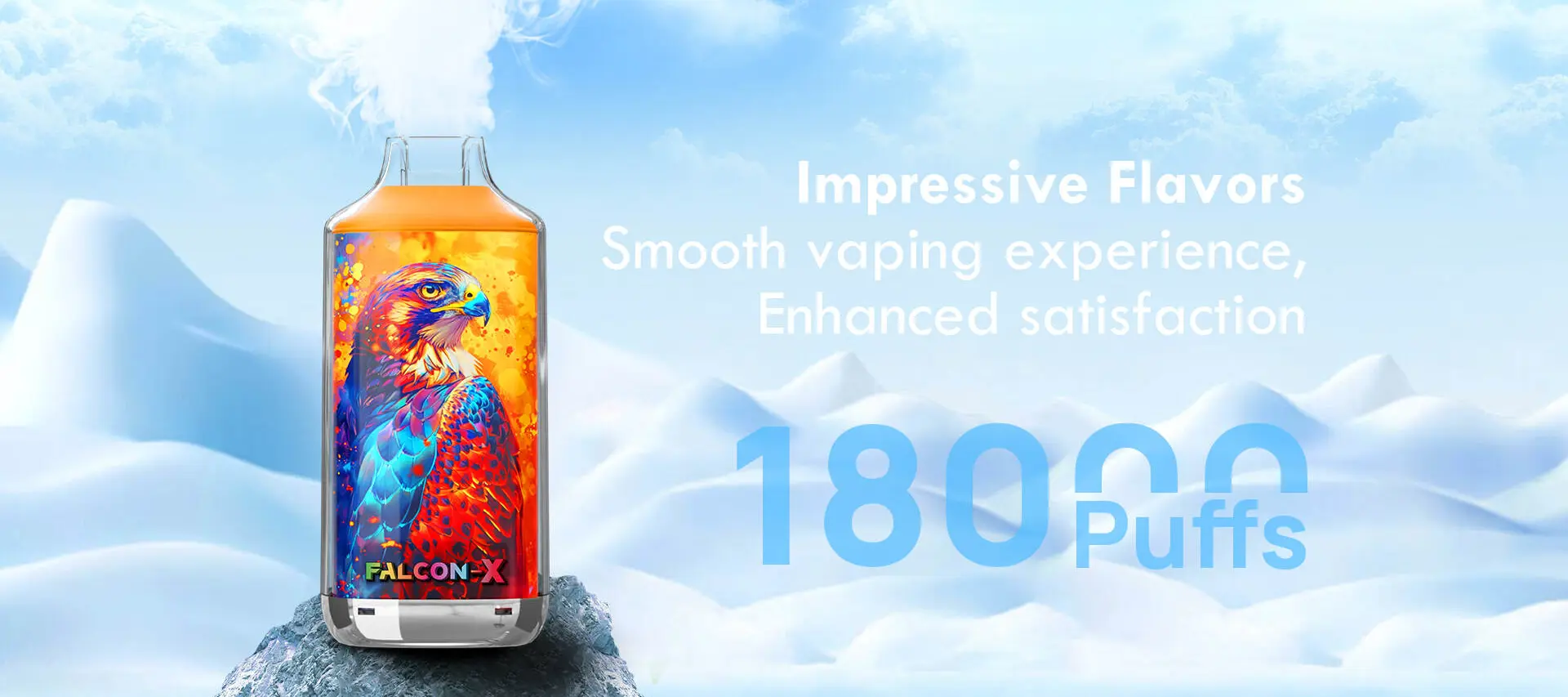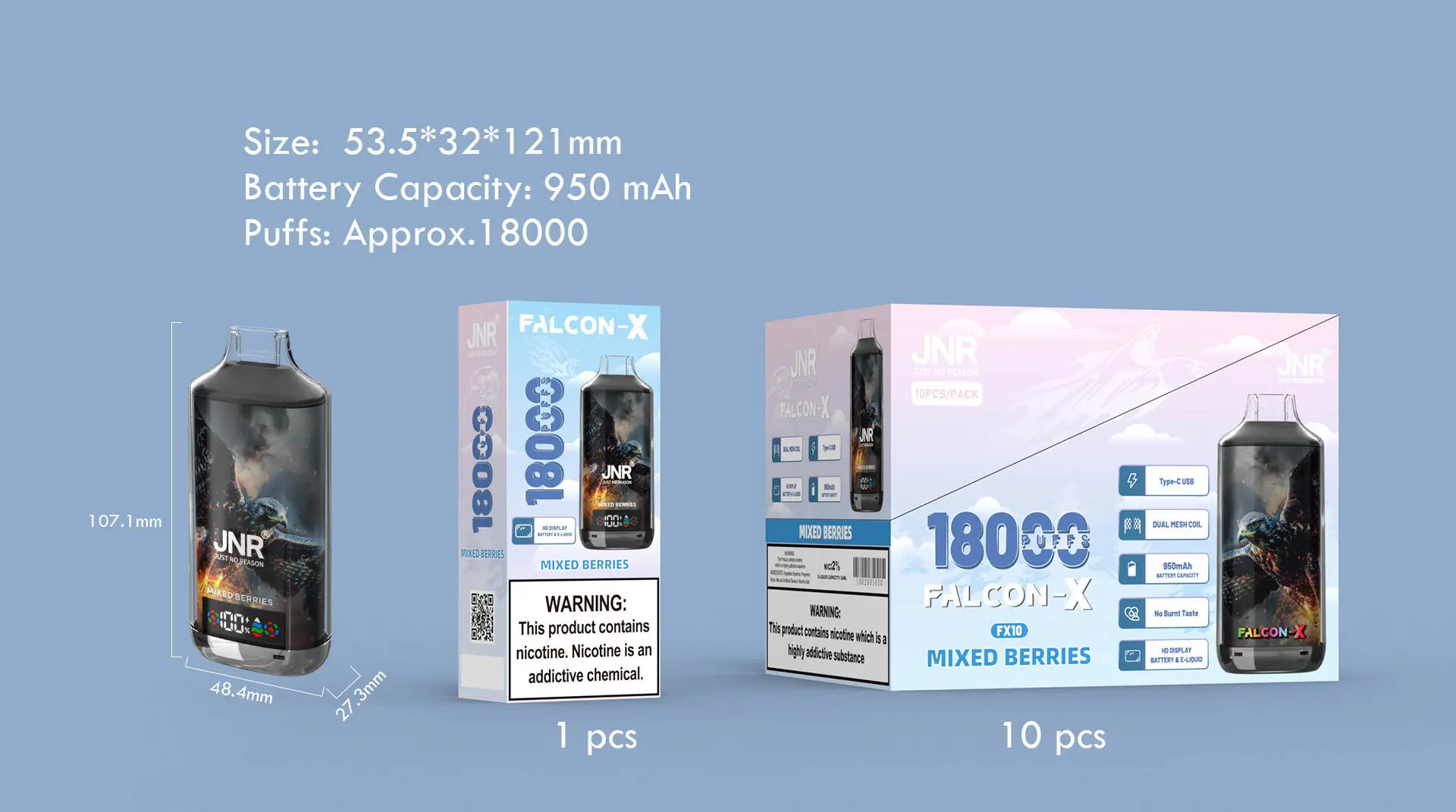 JNR Falcon X 18000 Puffsは、24 mLプリチャージ済みリキッド950 mAhリチャージャブルバッテリーを搭載し、最大18,000回の吸引を提供するプレミアム使い捨てVAPEです。