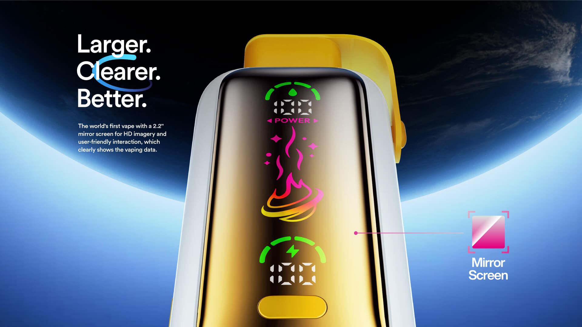 2.2インチHDミラータッチスクリーンDual Mesh Coil+Dual Mode(Eco/Power)による均一加熱で、未来的なデザインと共にクリアかつパワフルなクラウドを提供します。
