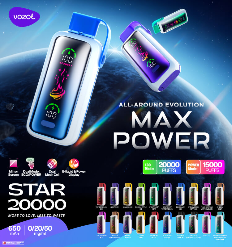 VOZOL Star 20000 Puffsは、650 mAh内蔵バッテリー20 mLプリチャージ済みリキッドを搭載し、最大20,000回吸引を実現する高機能ディスポーザブルVAPEです。